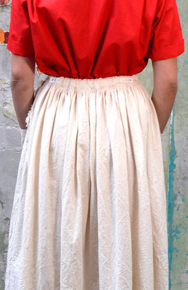 gathered skirt with elasticated back and extra adjustable waist channel detail. huge patch pockets with tab label, raw edge hem, and red topstitching throughout. concealed zip and decorative waist toggle at side waist band.