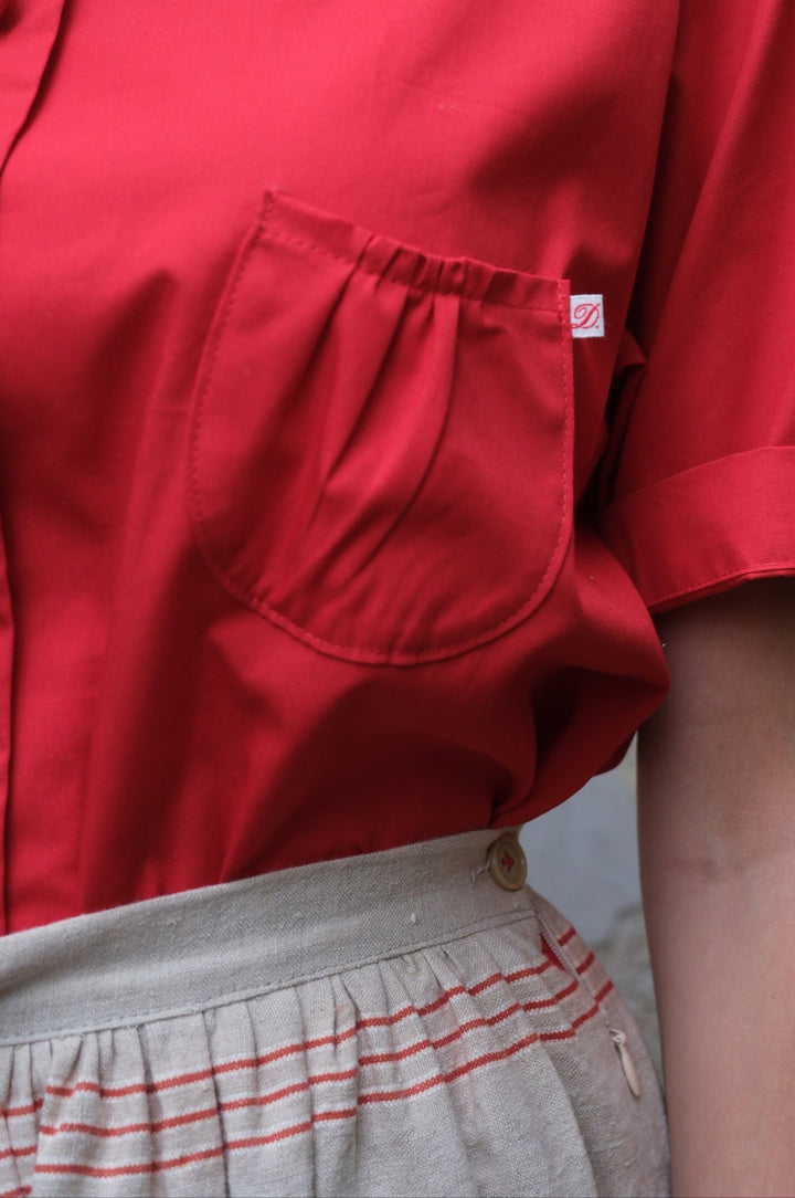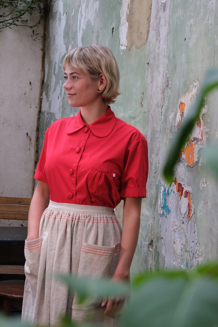 gathered skirt with elasticated back, huge patch pockets with tab label, concealed zip, and red topstitching throughout.